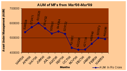 The other top mutual funds, in terms of AUM, UTI MF fell by 0.96% to Rs 48754.17 in March 2009. Birla Sun Life MF has decreased by Rs 1459 crore (3.01%) to Rs 47096.23 crore in its AUM and SBI MF also witnessed a fall of 4.50% to Rs 26382.68 crore in March 2009 over February 2009.