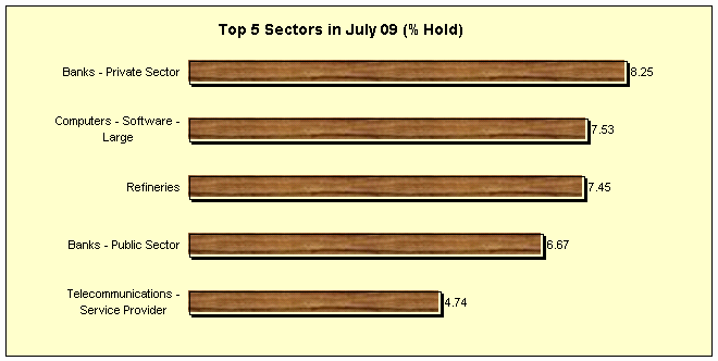 It was followed by Computers, Software - Large sector with 7.53% holding and market value of Rs 5938.89 crore. Refineries Sector stood at third position at 7.45% with market value of Rs 5878.89 crore in the month of July 2009. Banks Public Sector took 6.67% share having market value of Rs 5263.11 crore in total market value. Telecommunications - Service Provider hold market value of Rs 3740.12 crore with 4.74% in July 2009.
