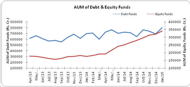 AUM of equity funds increased 6.7% (by Rs 18984 crore) to Rs 3.02 lakh crore in January 2015 over December 2014. The assets of equity-linked saving schemes (ELSS) increased by 6.8% (by Rs 2474 crore) to Rs 38731 crore. Meanwhile, Equity Funds registered a net inflow of Rs 5850 crore for the month and ELSS Funds saw net inflow to a tune of Rs 474 crore.